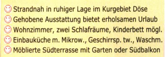 Auf Anfrage können wir Ihnen weitere Ferienwohnungen in Cuxhaven-Döse vermitteln.